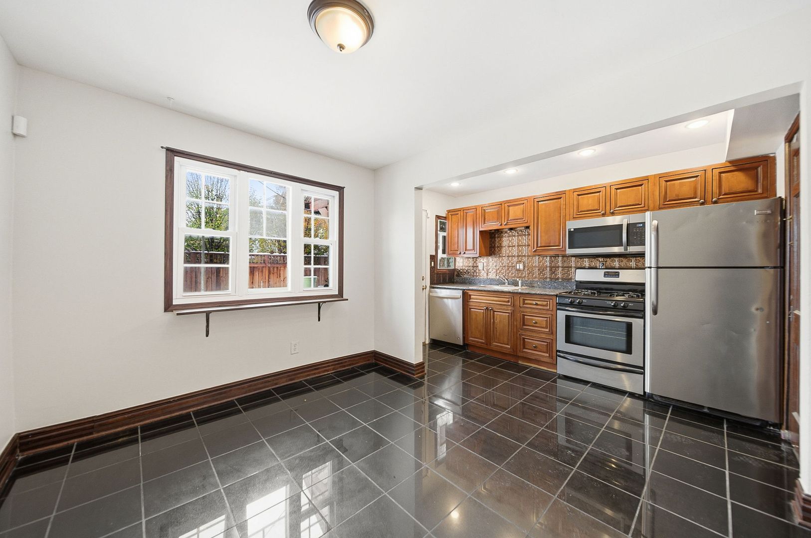 Charming 2 bedroom, 2 full bath turn of the century townhome located directly across from Franklin Park Conservatory & Botanical Gardens. The living room offers refinished hardwood flooring, a decorative stone fireplace and the large window allows plenty of natural light. The eat-in kitchen offers marble flooring, stainless steel appliances and granite countertops. The quaint rear deck is perfect coffee in the mornings or just enjoying the fenced in shared back yard. Upstairs you'll find 2 bedrooms and a full bathroom with jetted tub and the Primary bedroom has a 3rd floor private ensuite with full size shower and extra storage. The full size basement provides laundry machines and plenty of space for storage.