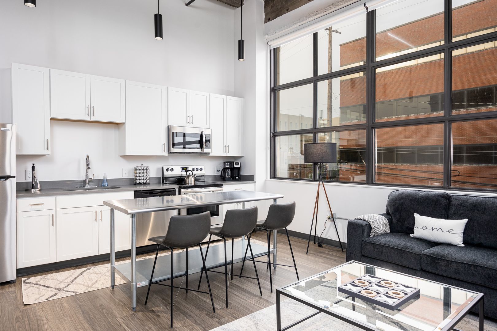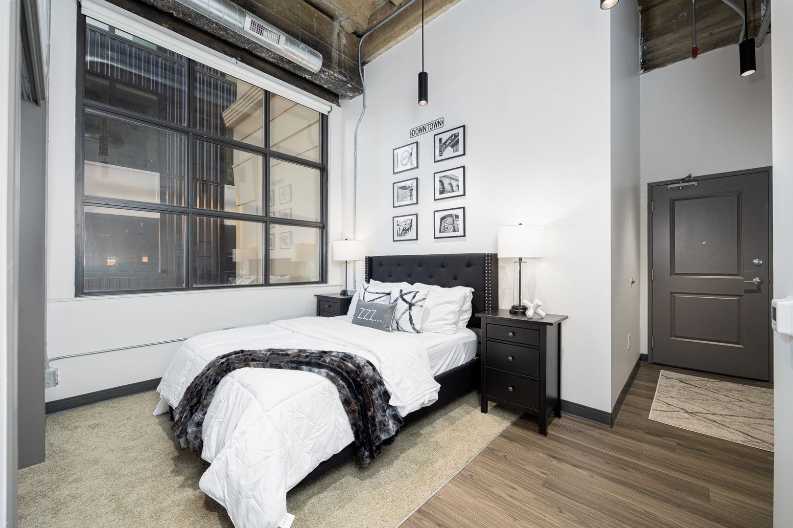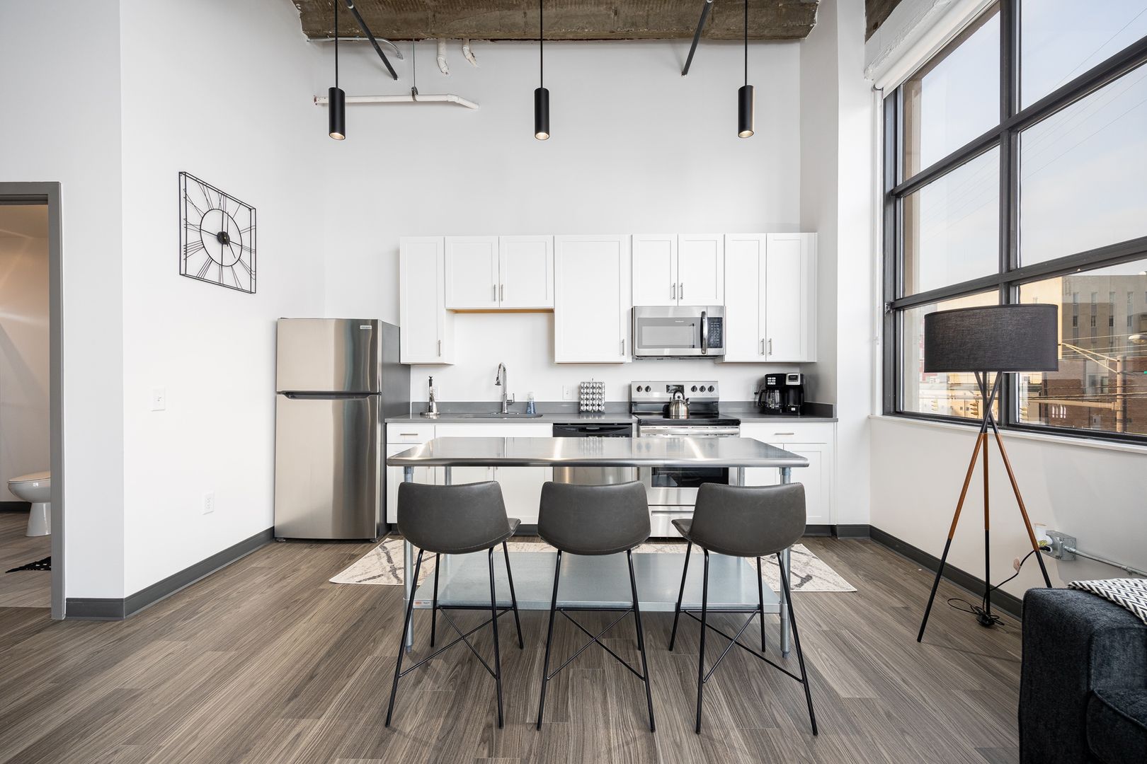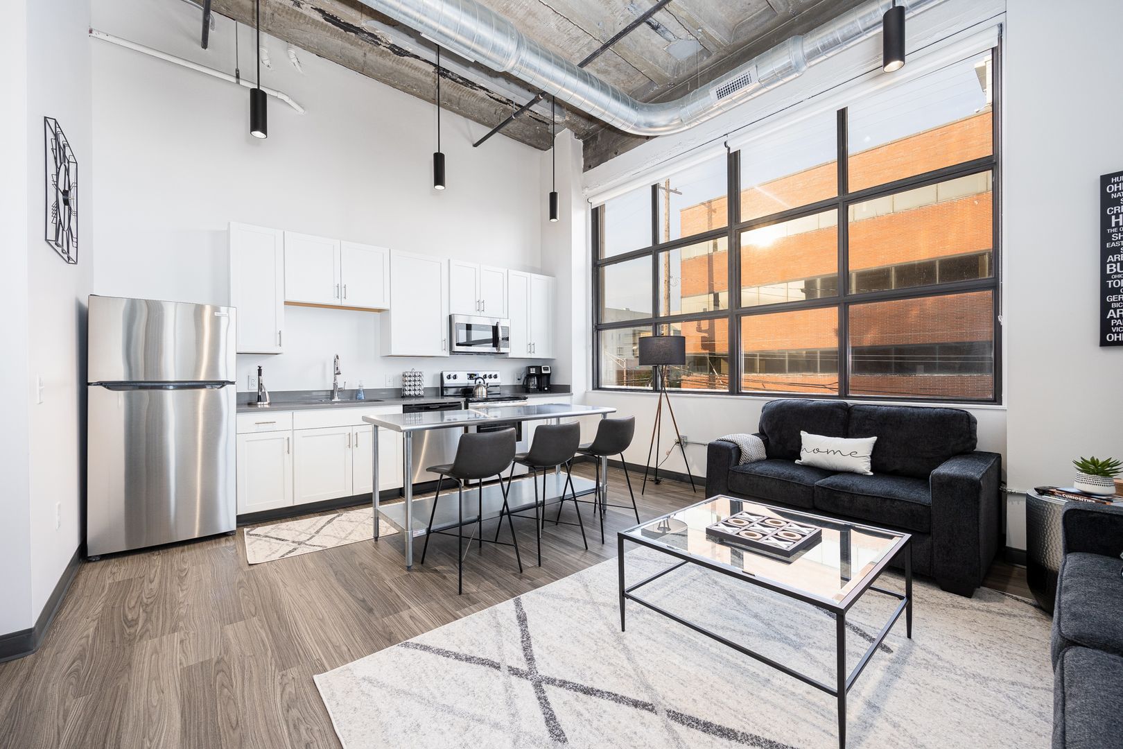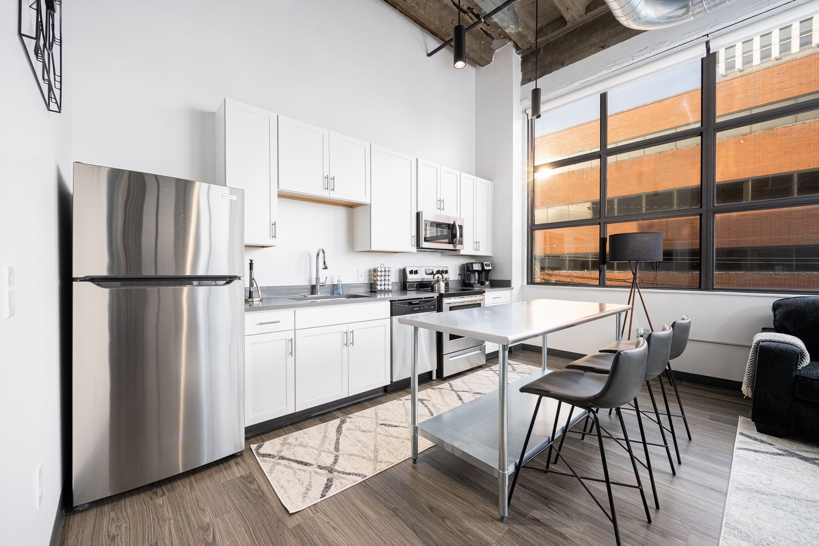 This industrial loft style unit features 16 foot ceilings with exposed beams and ductwork, granite countertops, stainless appliances, vinyl flooring, kitchen island, fiber internet and large walk-in closets. The oversized bathroom offers plenty of storage and ample room to add more storage if desired.