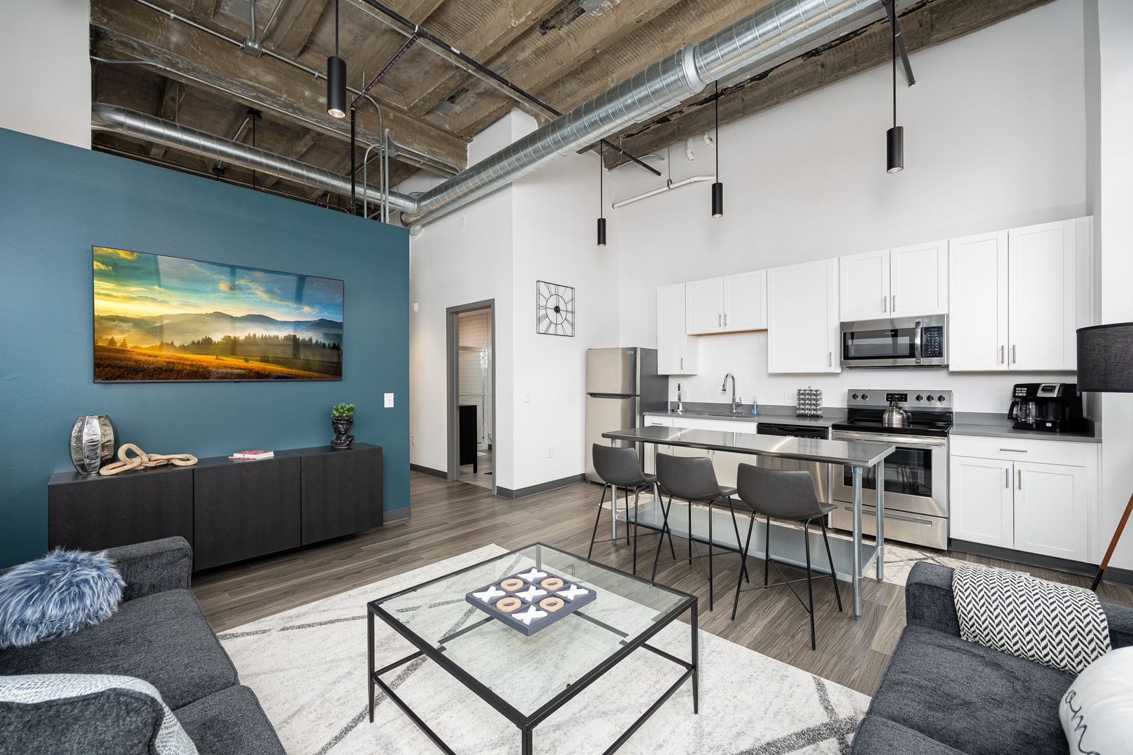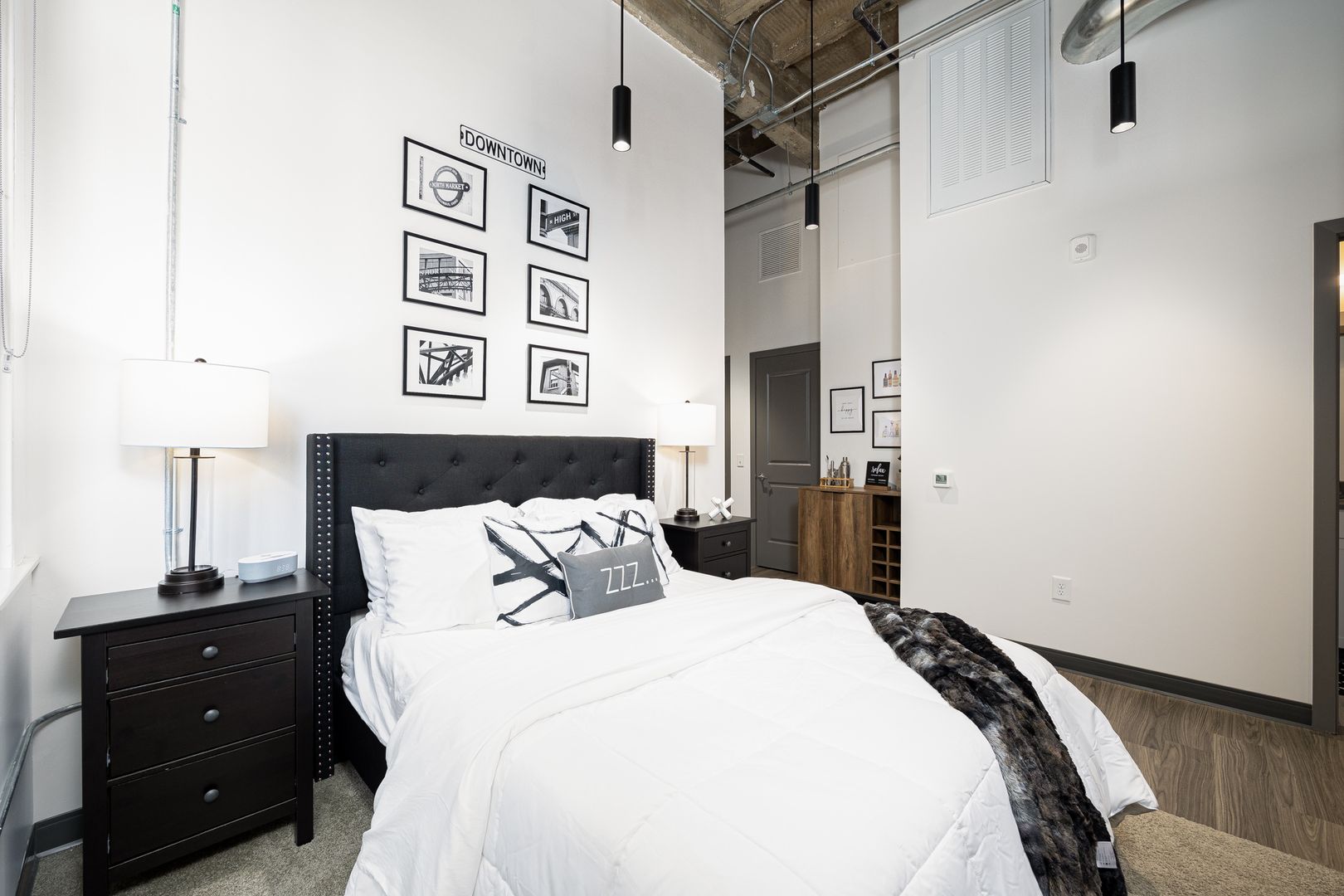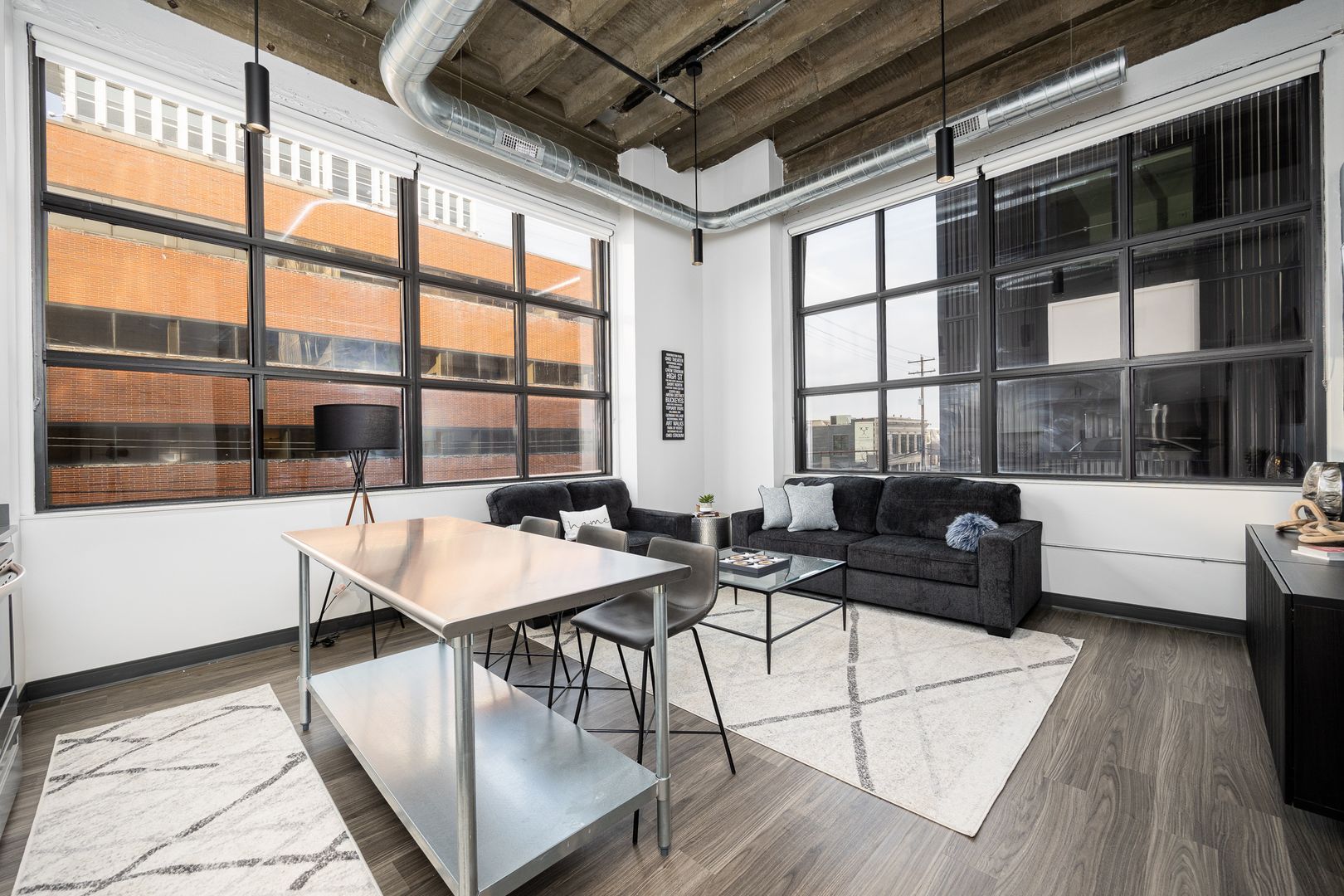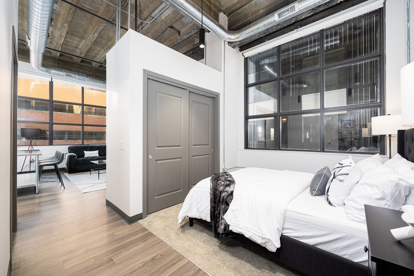 This industrial loft style unit features 16 foot ceilings with exposed beams and ductwork, granite countertops, stainless appliances, vinyl flooring, kitchen island, fiber internet and large walk-in closets. The oversized bathroom offers plenty of storage and ample room to add more storage if desired.