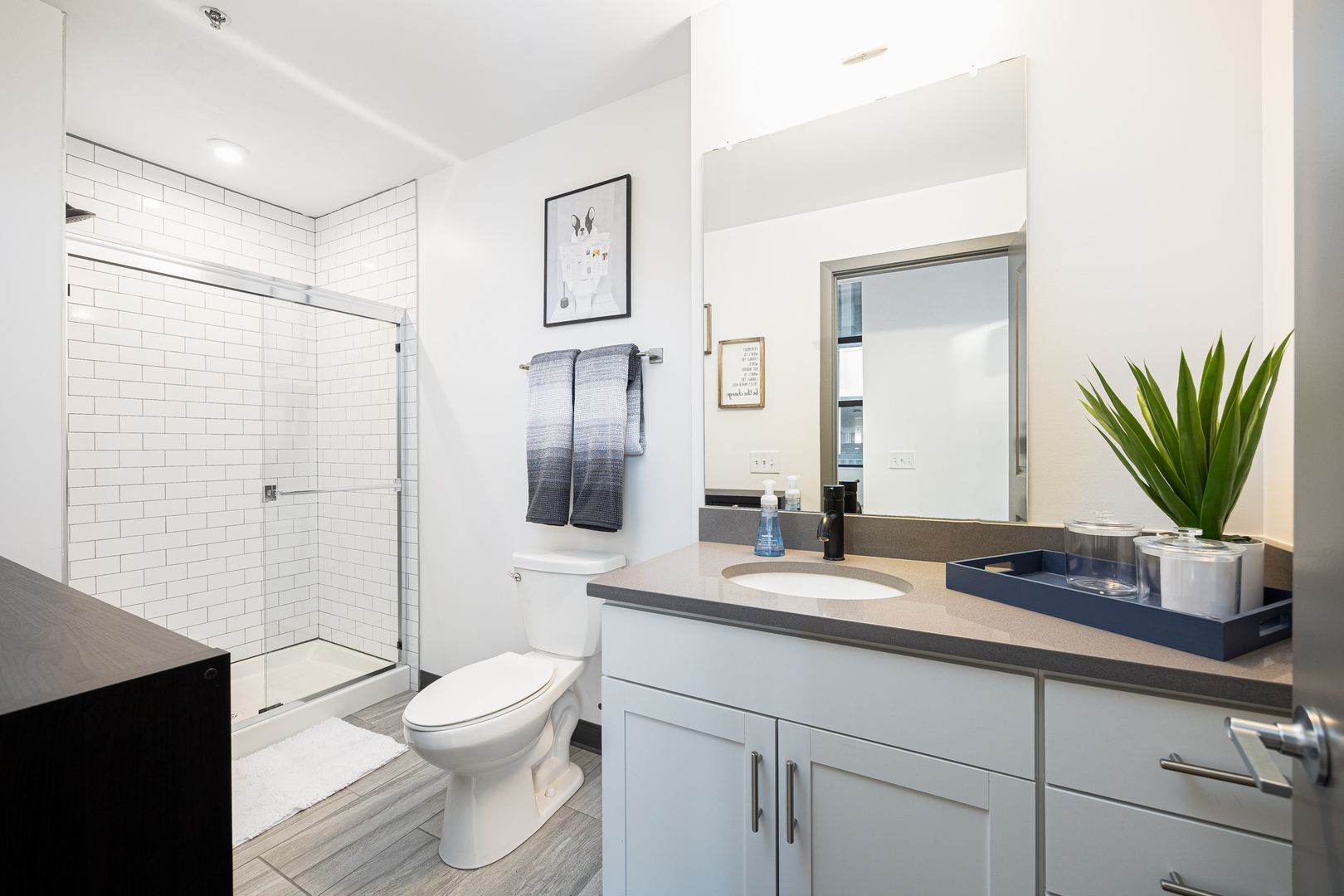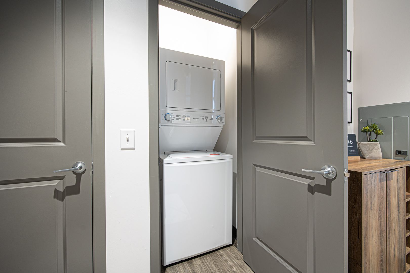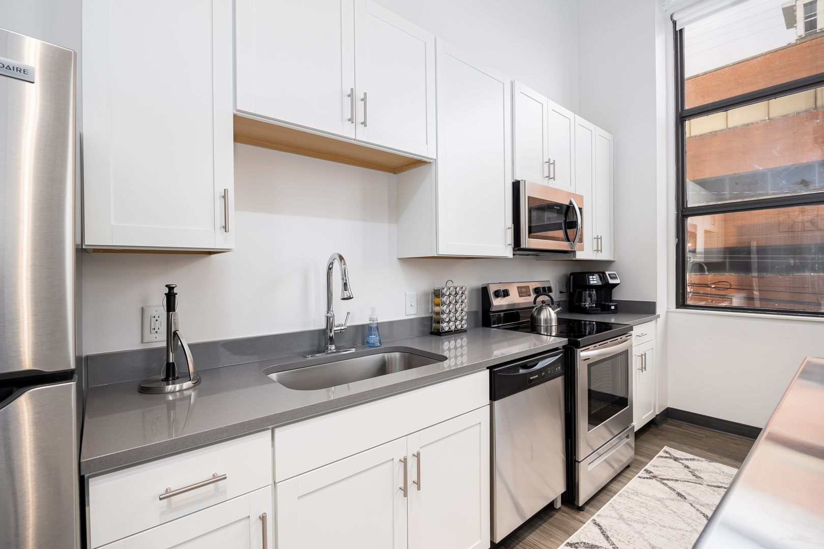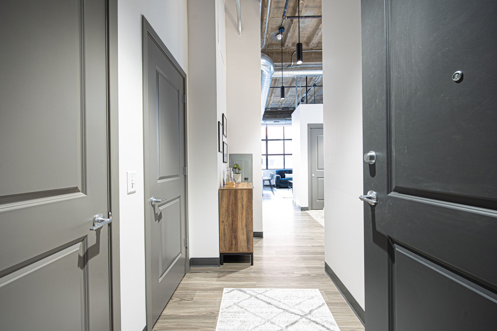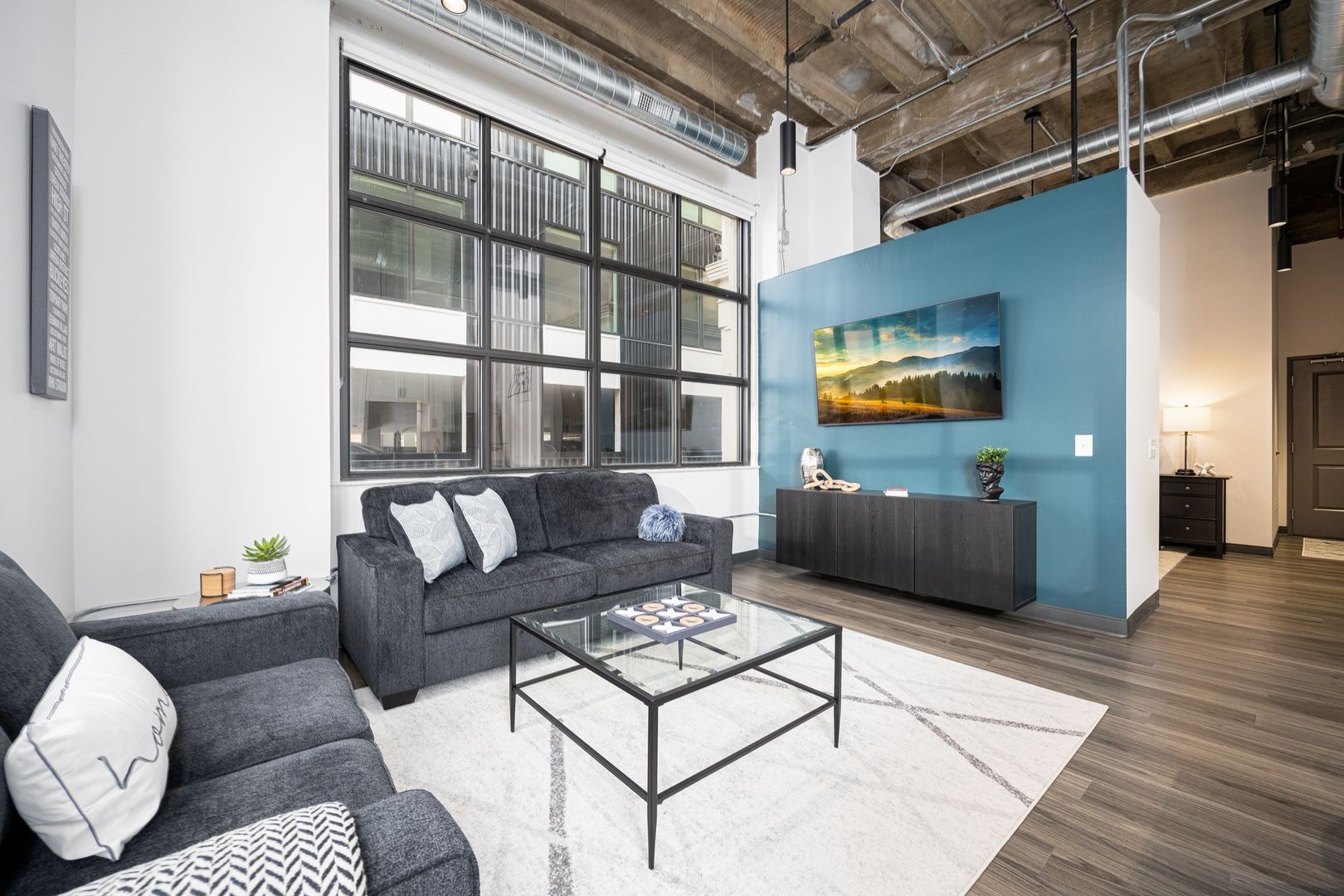 This industrial loft style unit features 16 foot ceilings with exposed beams and ductwork, granite countertops, stainless appliances, vinyl flooring, kitchen island, fiber internet and large walk-in closets. The oversized bathroom offers plenty of storage and ample room to add more storage if desired.