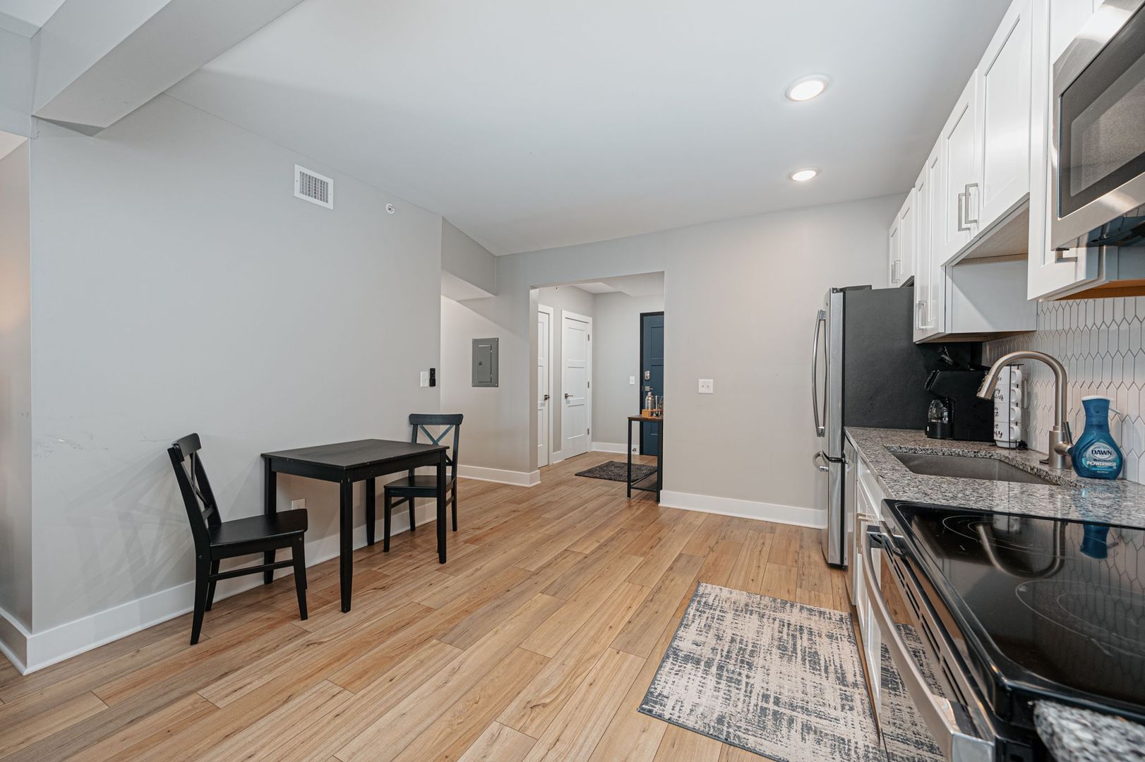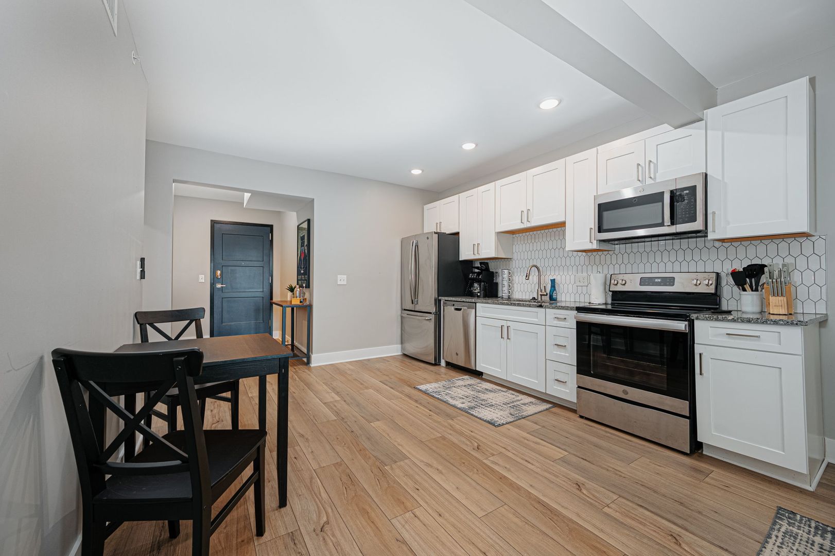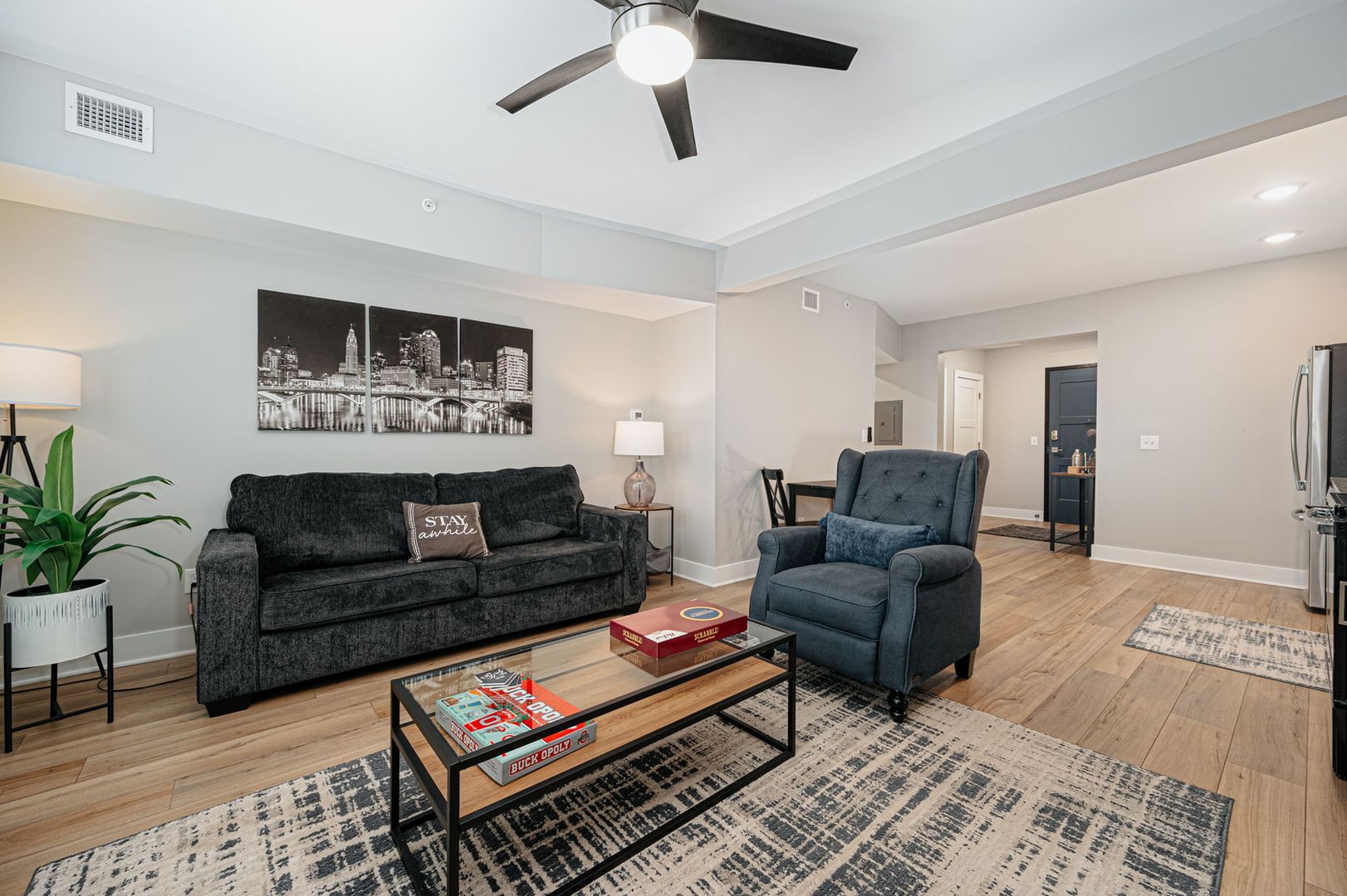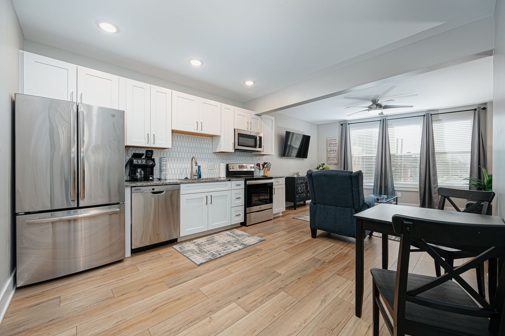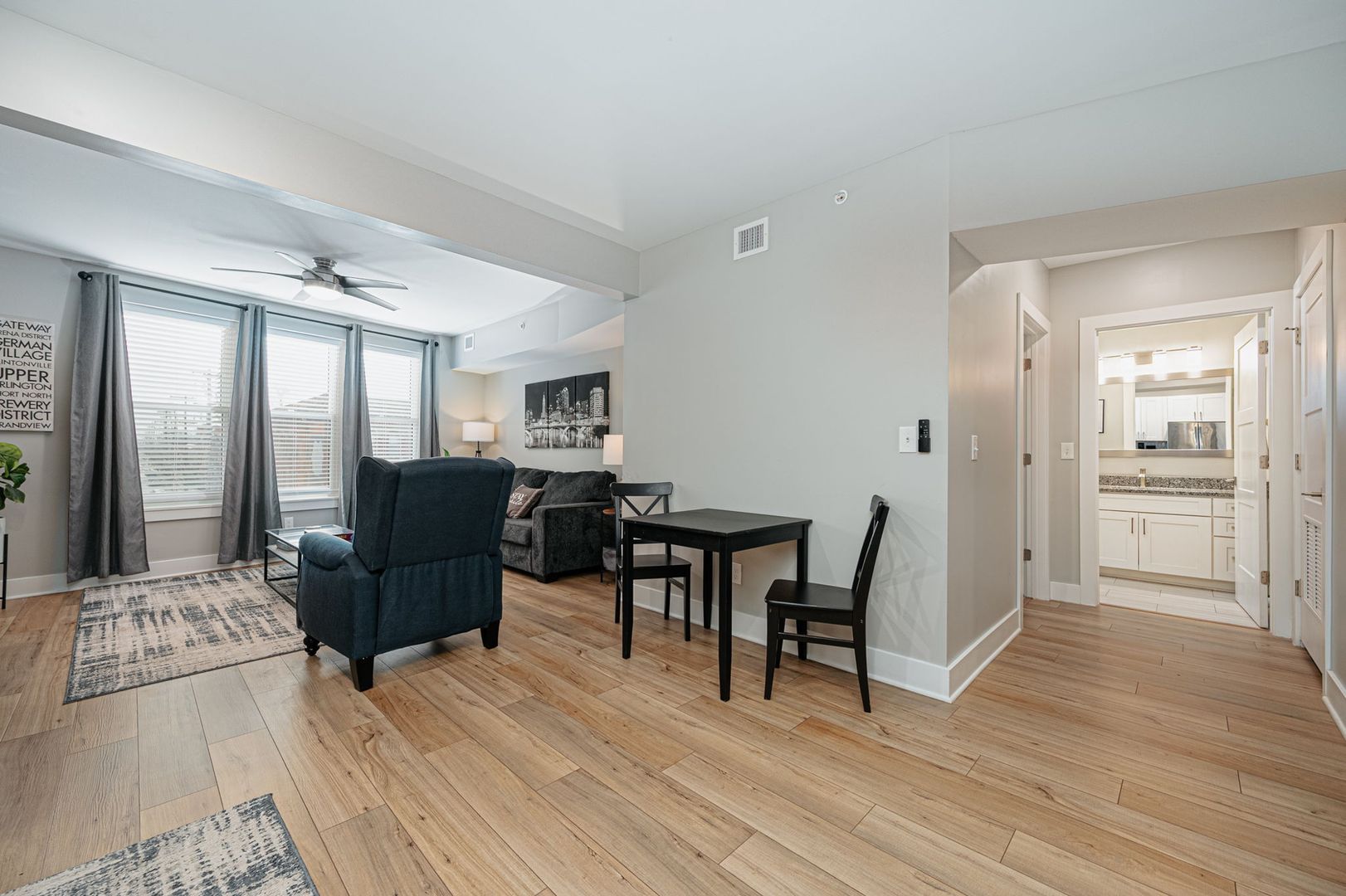1 bedroom, 1 bathroom located in the heart of the Short North Arts District! Completely renovated (2022) historic building with High Street views, offering high end modern finishes including; LVT wood flooring, 4 piece stainless steel appliance package, plush carpeting in bedroom, secure building access with keyless entry, secure mail and package room, ceiling fans, central air conditioning, granite countertops, off street parking available, high speed WiFi internet and cable TV package included, on-site laundry facilities and built in USB outlets throughout. This is a furnished unit which offers a fully equipped kitchen with small appliances, dishes, cookware & utensils, the bedroom offers a King size Beautyrest pillowtop mattress with lush bedding, a desk and WiFi color printer for those work form home days a large dresser and a walk-in closet. The oversized bathroom has plenty of soft linens, hair dryer and an abundance of storage. Just bring your clothes! Within walking distance to many of Columbus's top rated restaurants, bars, nightclubs and theaters, few short minutes from Riverside Methodist Hospital and just 1 mile to OSU Campus or Downtown Columbus in either direction.!